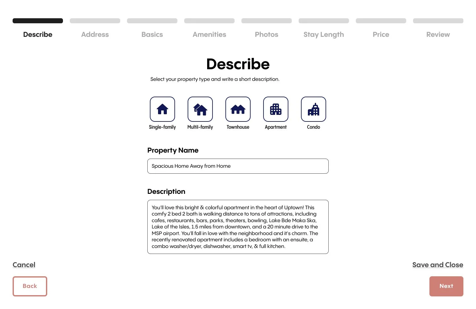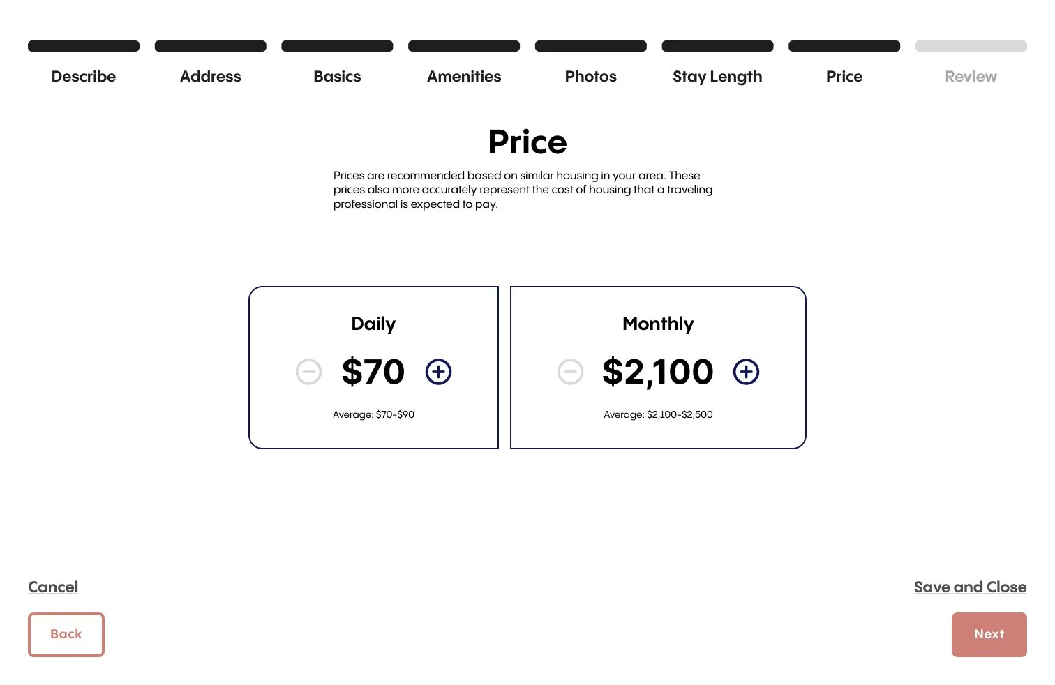 I walked through the add property process on AirBnB and VRBO to understand what already existed. I learned that generally, adding a property had low friction and any extra details were available to users later. The challenge was to take what already worked well in this space, and make it unique to ATPH. I went back to our guiding questions. What was ATPH's unique value add? Connecting traveling professionals with longer-term temporary housing. With that in mind, I started designing.
