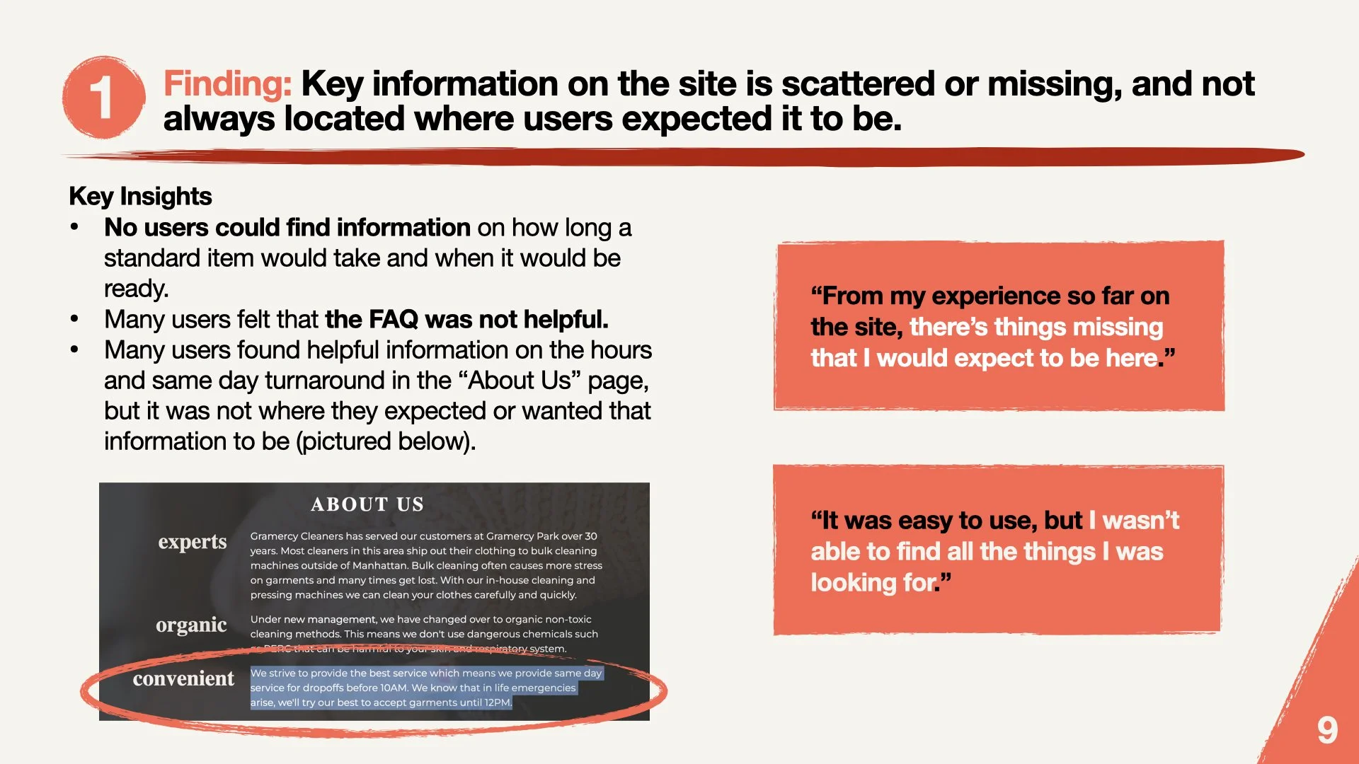 After each conducting our own heuristic analysis, our team combined our insights and modified our initial task list. We then built out scenarios from the tasks and constructed our evaluation plan. In addition to the scenarios, participants were also asked to rate their confidence in the information on the site, the site’s ease of use, the trustworthiness of Gramercy Cleaners, and the likeliness that they would use Gramercy Cleaners’ services.