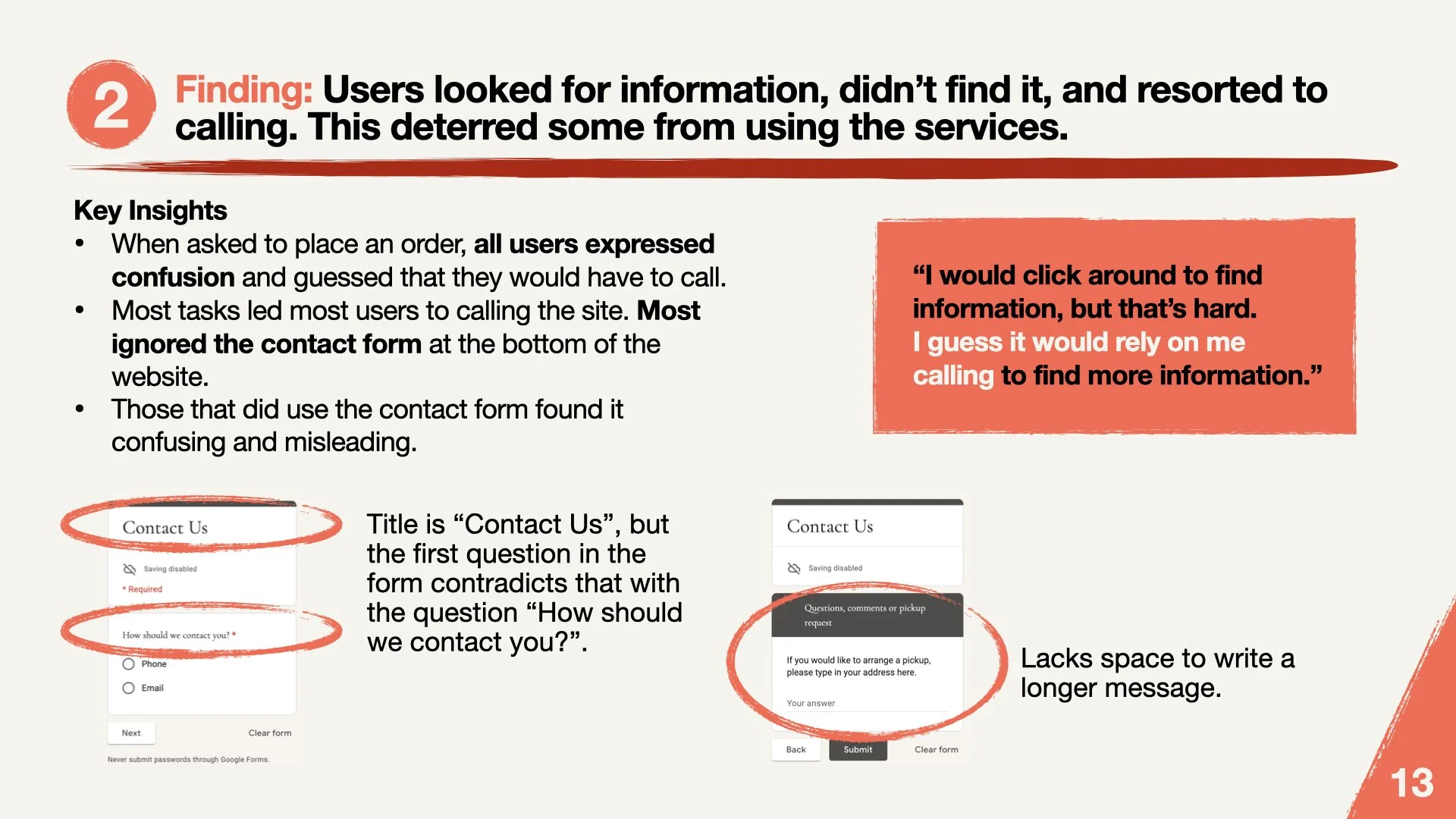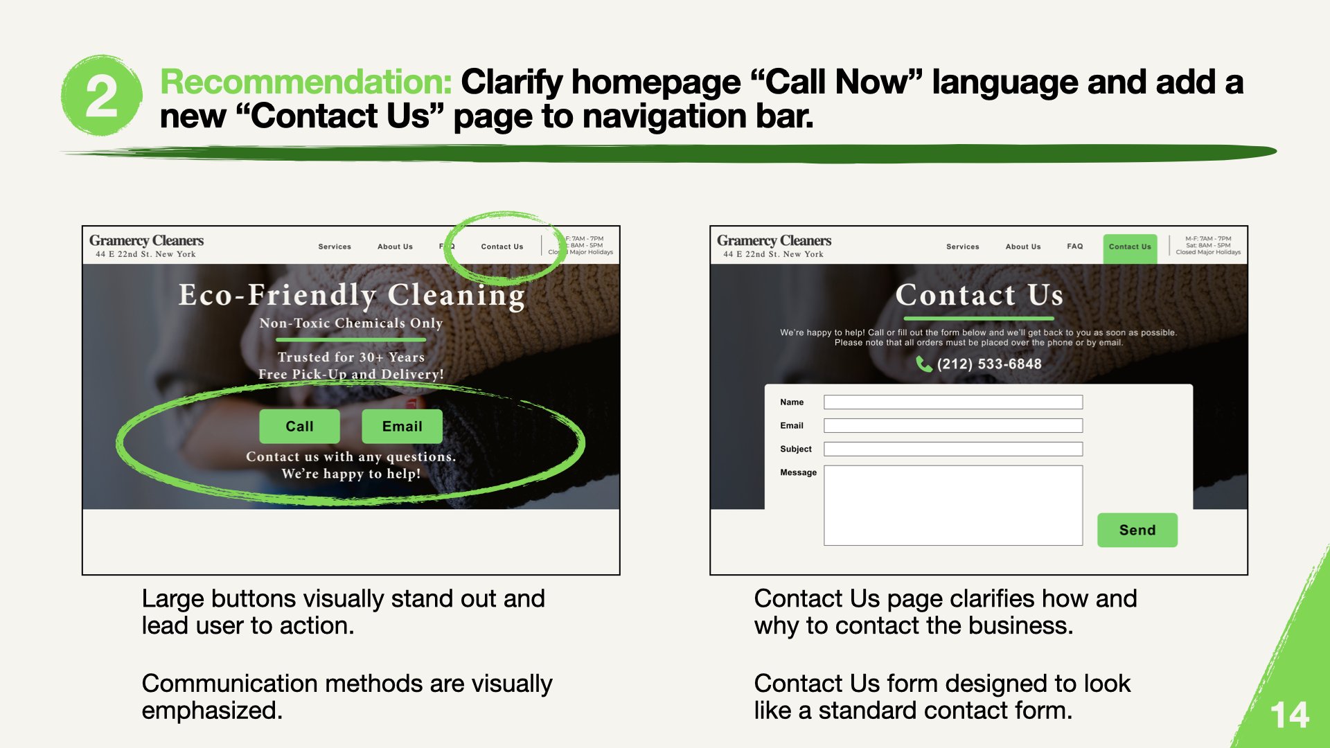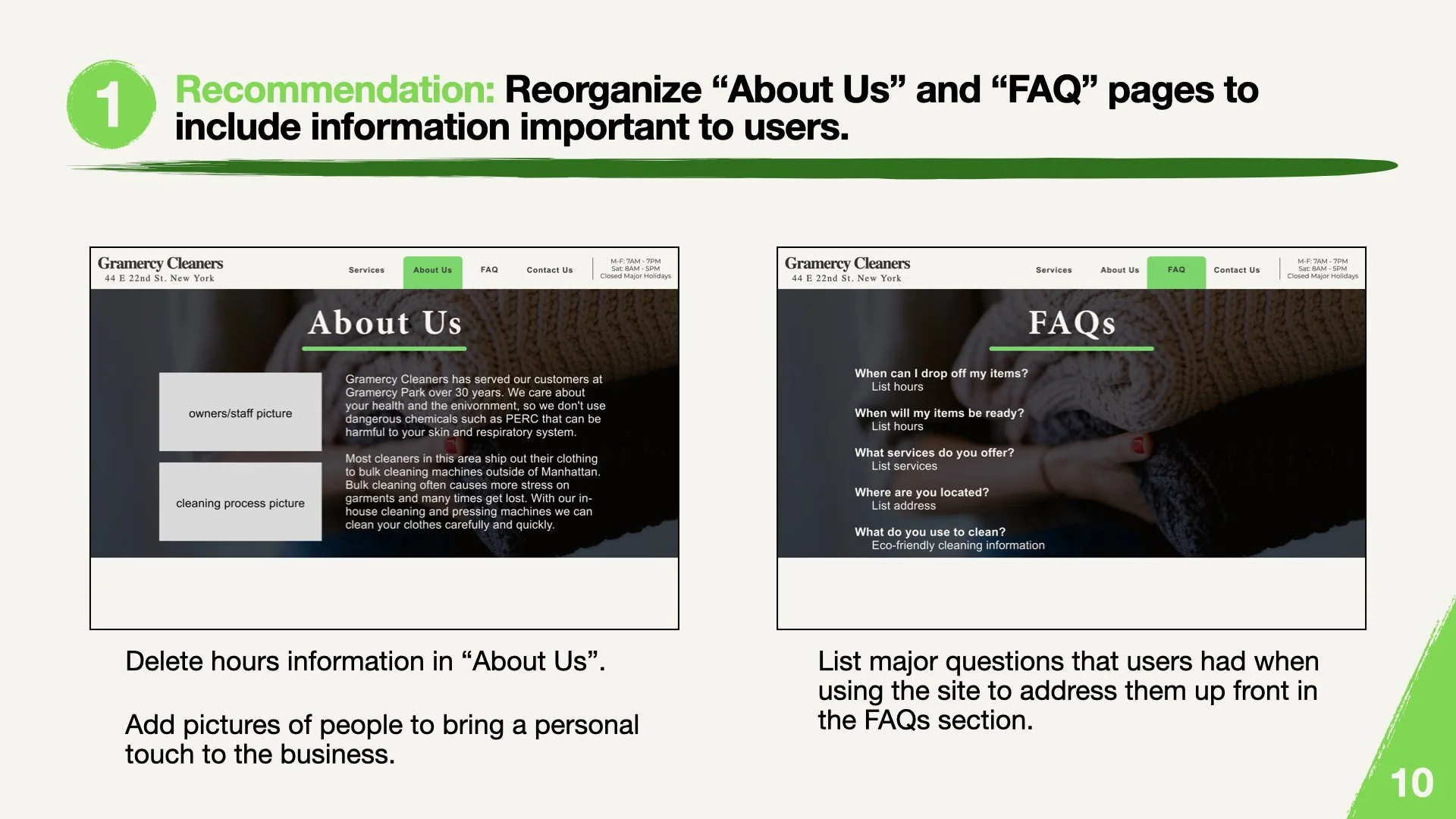 I conducted a heuristic analysis of the website, testing it against Jakob Nielsen’s 10 Usability Heuristics. I found major violations of flexibility and efficiency of use, and consistency and standards. Many parts of the website were not standardized such as the contact form and the “About Us” page. Additionally, key information was missing from the website such as drop-off/pick-up times.