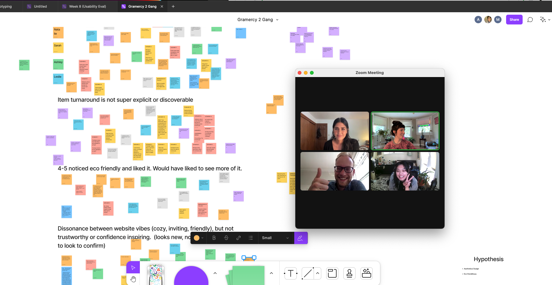 We conducted usability tests over Zoom with 12 participants who met relevant criteria to the study. Each session was roughly 30-min. I conducted 2 individual usability tests and 5 group usability tests. In the group usability tests, I moderated 1 test, was the technical lead for 1 test, and observed/took notes for 3 tests.
